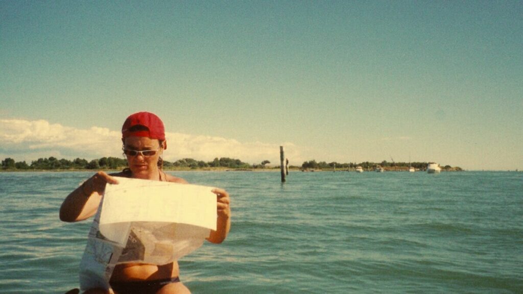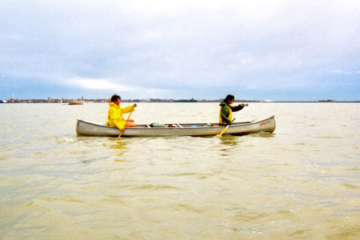 Quando le sponde dei canali erano coperte di alti canneti (capitava spesso) non si vedeva l’orizzonte, le mappe allora servivano poco e non restava che andare a naso, guardando la direzione della corrente. Sbagliare l’imbocco di un canale, per passare da una laguna all’altra, significava perdere ore di forza fisica e luce diurna. Non c’erano bar lungo la via dove fermarsi per chiedere informazioni, perciò quando incontravo altre barche sbracciavo esagitata per farle fermare e avvicinare giusto il necessario per chiedere “Scusi, per Venezia?”. Dopo una risata (i più pensavano ad uno scherzo) chiedevano sempre “Ma da dove vieni? Ma a remi?” e così, dondolando sulle proprie barche, iniziava un dialogo sul motivo del viaggio, l’itinerario, l’attrezzatura, la fatica e i consigli su dove fermarsi la notte, magari vicino ad una trattoria lagunare.